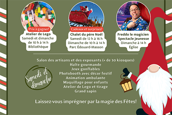 L’espace d’une fin de semaine, l’hôtel de ville, le local du Club de l’Âge d’Or du Lac Masson, la bibliothèque ainsi que le parc Édouard-Masson se transformeront à nouveau en « village de Noël » avec plusieurs activités ainsi qu’une trentaine d’artisans qui vous feront découvrir leurs créations.